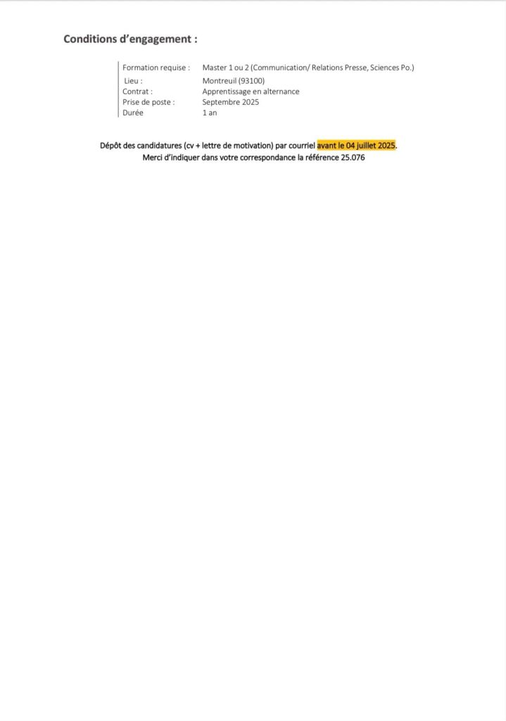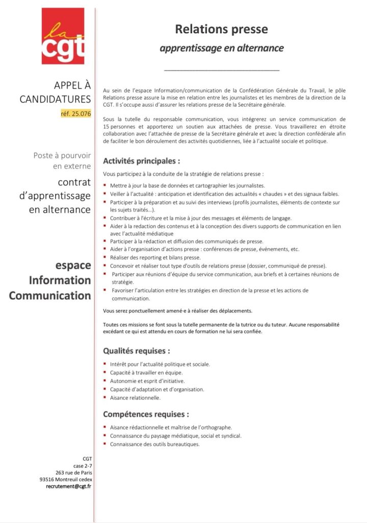 – Offre d’apprentissage ou d’alternance en communication syndicale et relations presse à la CGT (publiée le 27 juin 2025) – (merci Marylie Breuil pour l’info)